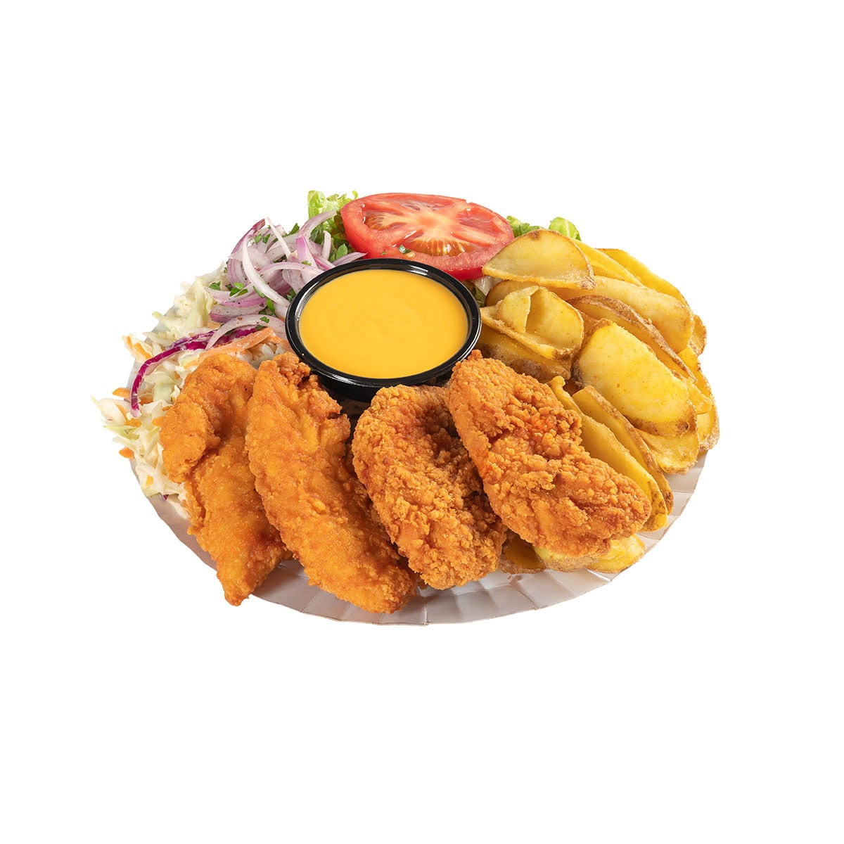 Chifla 130 g, Crispy Fingers 170 g, Cartofi Prajiti 160 g, Salata Creata 20 g, Salata de Varza 120 g, Rosii Felii 30 g, Sos Crispy 50 g