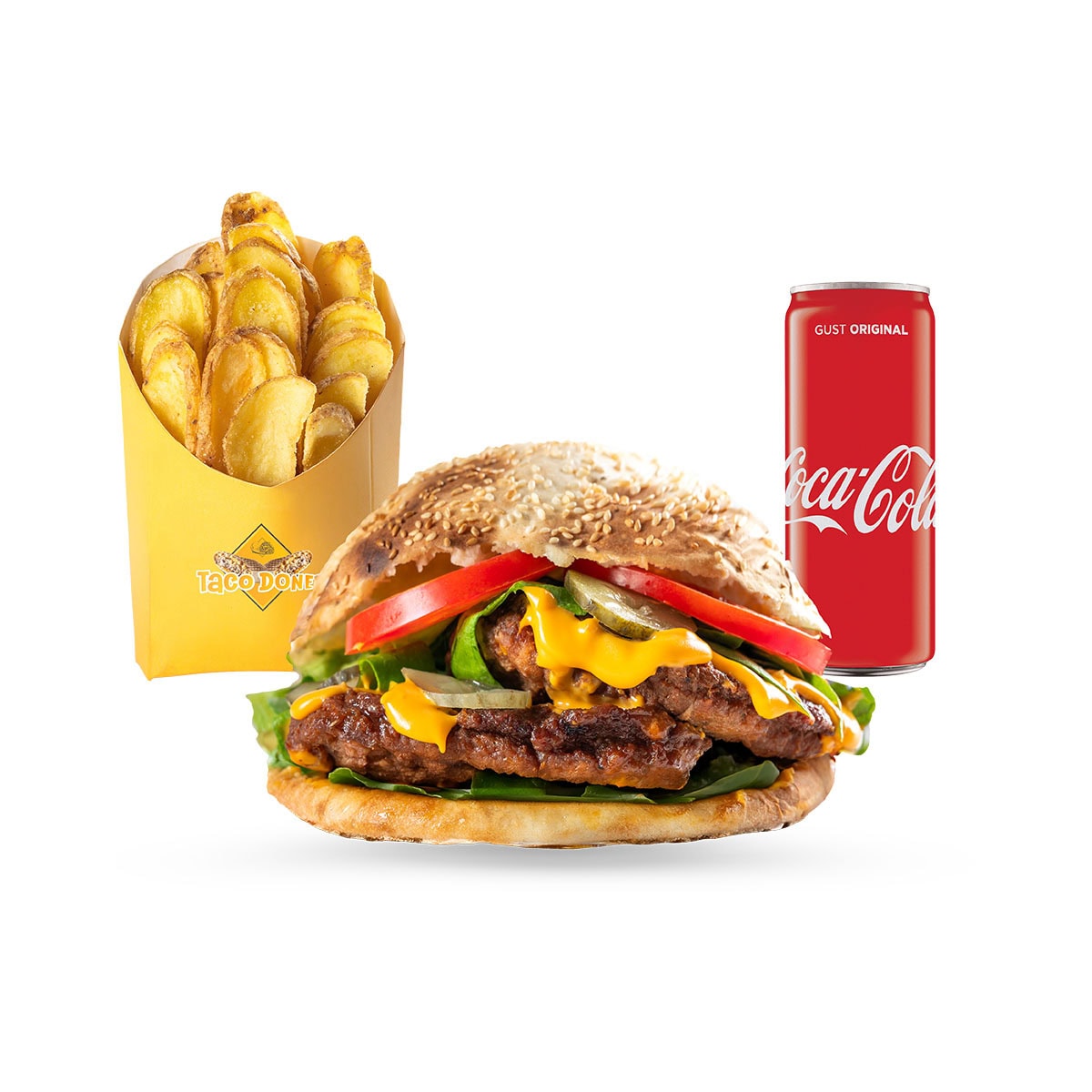 1 Sandwich Burger de Pui 360 g, 1 Portie de Cartofi Prajiti 160 g, 1 Bautura la alegere: 0.33 ml Gama Coca Cola, 1 Apa Plata sau Minerala 0.5 ml, 1 Ayran 0.250 ml.
